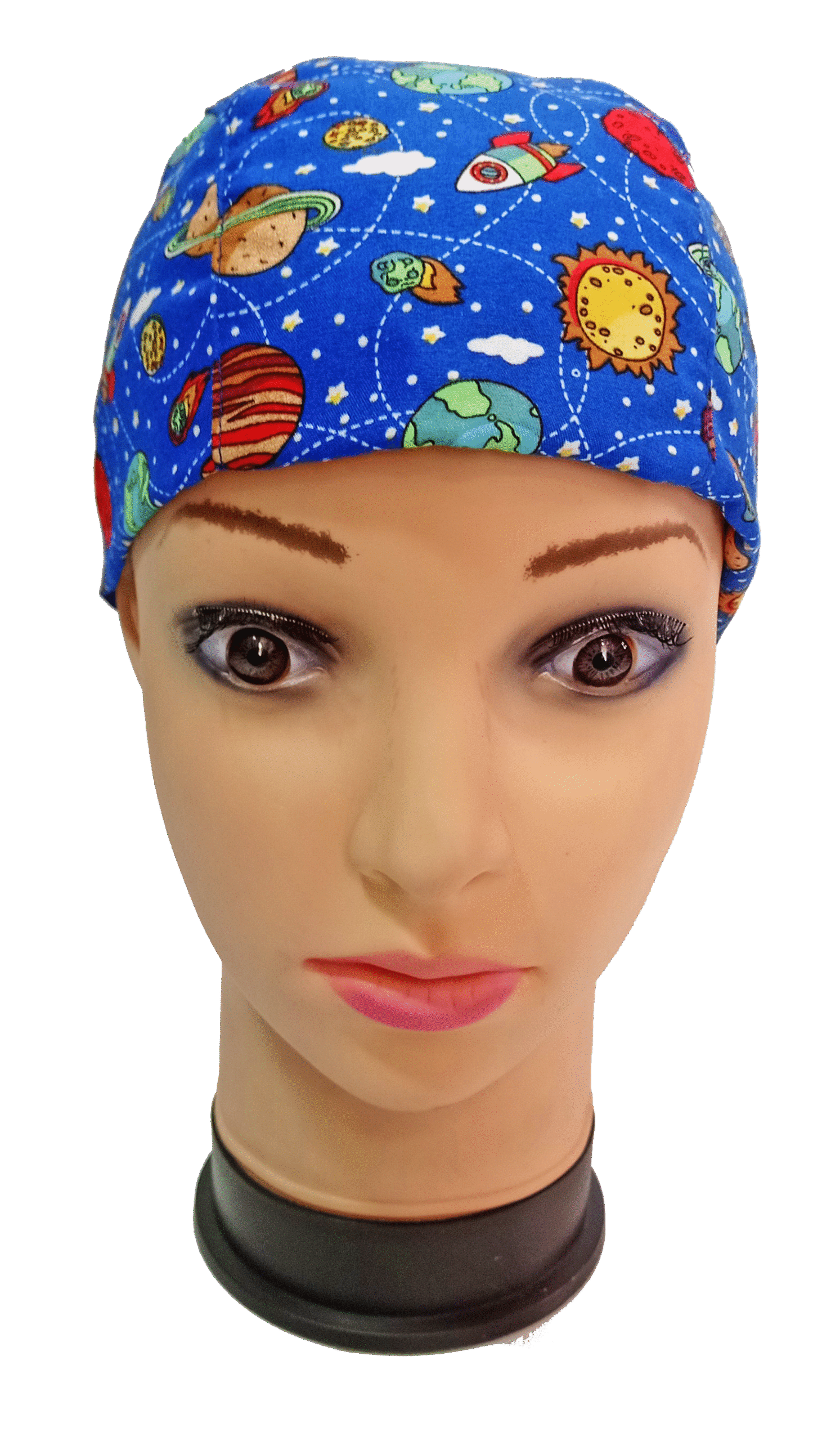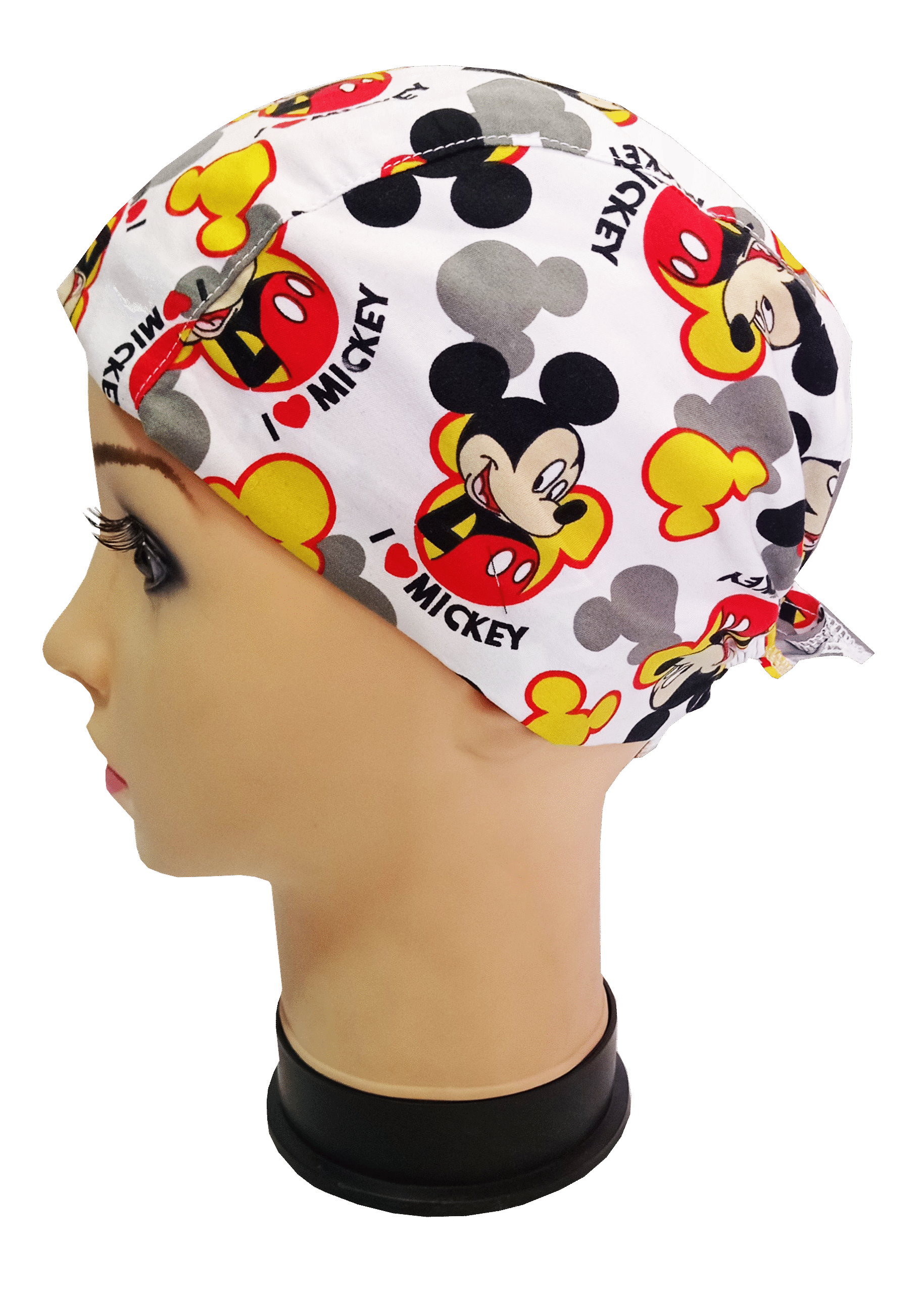 Gorro estampado tipo amarre, confeccionado en antifluido nacional, cómodo y resistente.